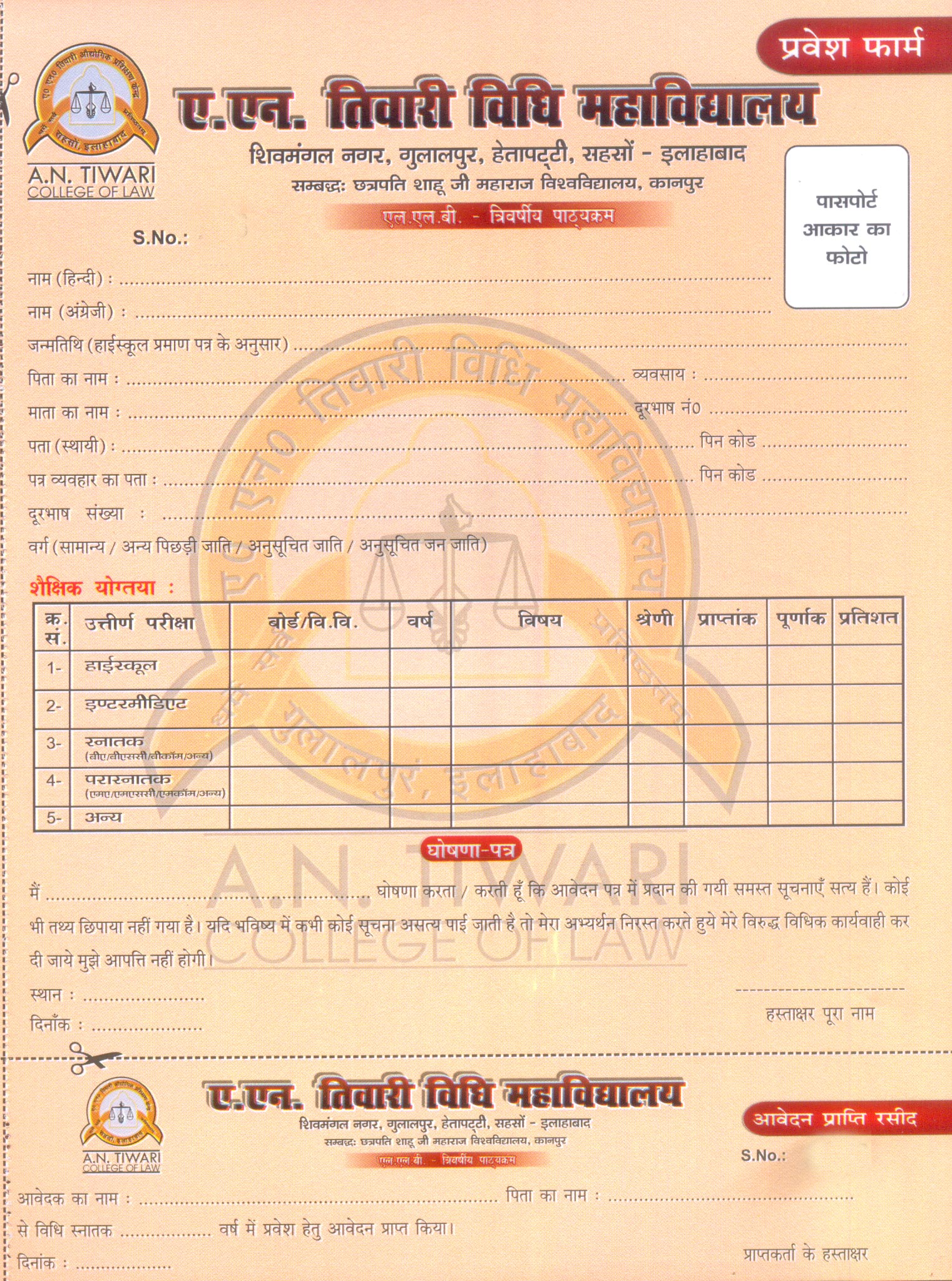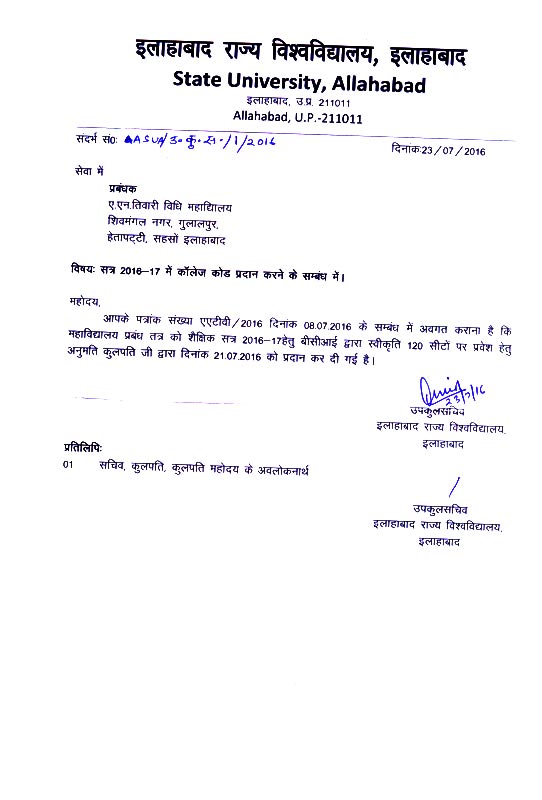 | A. N. Tiwari College of Law (Uttar Pradesh) is affiliated with the Allahabad State University, Uttar Pradesh. The College indeed has been equipped fully to render quality education to make professionals in law, Social Work and train them to become globally ready to step into profession successfully with dignity. The vision is to enrich the college for making it capable of conducting higher academic research, social research as well as project work. upgrade the legal education to Post-Graduate Legal Education. |